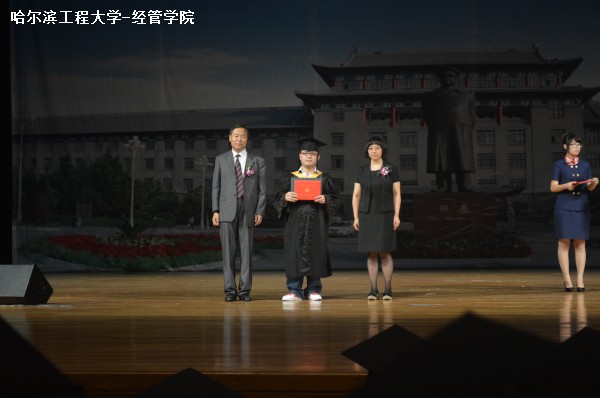 魏潾教授、宋艳教授为2014届本科毕业生拨动学位帽上的流苏,颁发毕业证书和学位证书,并与员工亲切握手,合影留念。