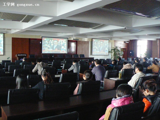 在公司多功能厅内,大家认真观看开幕式盛况,聆听胡锦涛总书记所做的工作报告。