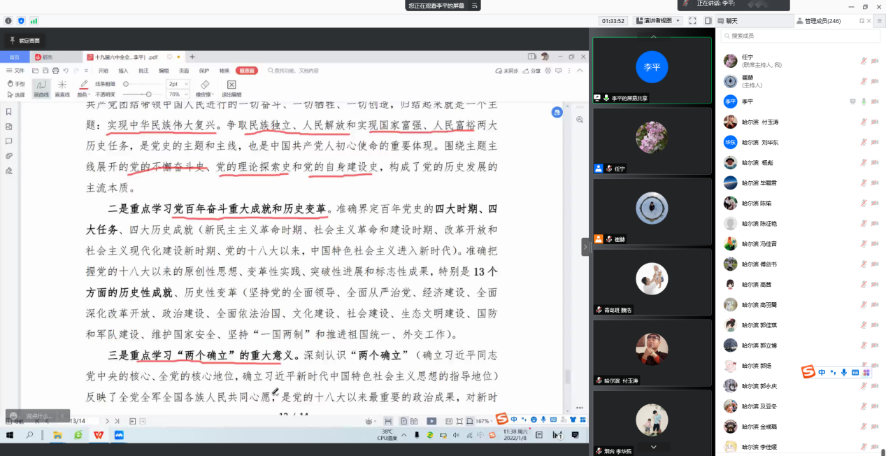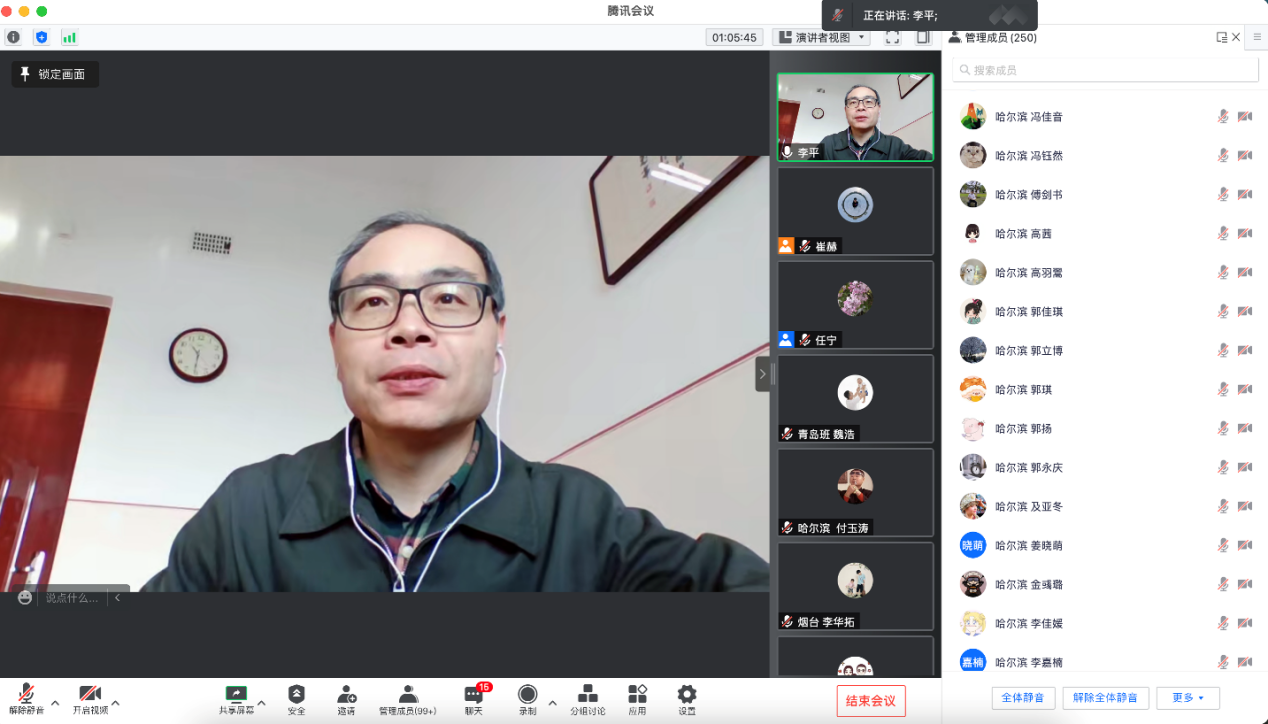 2022年1月8日,公司党委书记李平通过线上方式为2021级专业学位研究生做形势与政策报告,哈尔滨、烟台、青岛三地MBA和MPA共420余名同学参加报告会。
