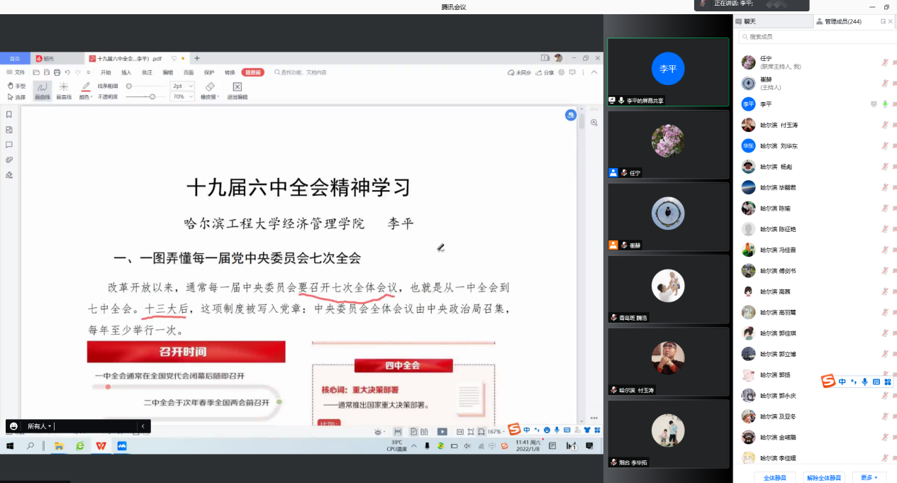 本次报告会上,李平书记以“十九届六中全会精神学习”为题,以《中共中央关于党的百年奋斗重大成就和历史经验的决议》为切入点,对中国共产党历史上三个重要历史《决议》从历史背景、历史使命、决议内容、历史贡献、历史意义、领导人的作用等方面进行了详细分析介绍,并对三个决议的关联做了分析。虽然时代背景不同,决议的侧重点不同,但因其承前与启后、继往与开来,三次重大历史决议成为了“中国共产党史的大纲”。李书记重点对如何学习十九届六中全会所做的《中共中央关于党的百年奋斗重大成就和历史经验的决议》提出了具体要求与建议。