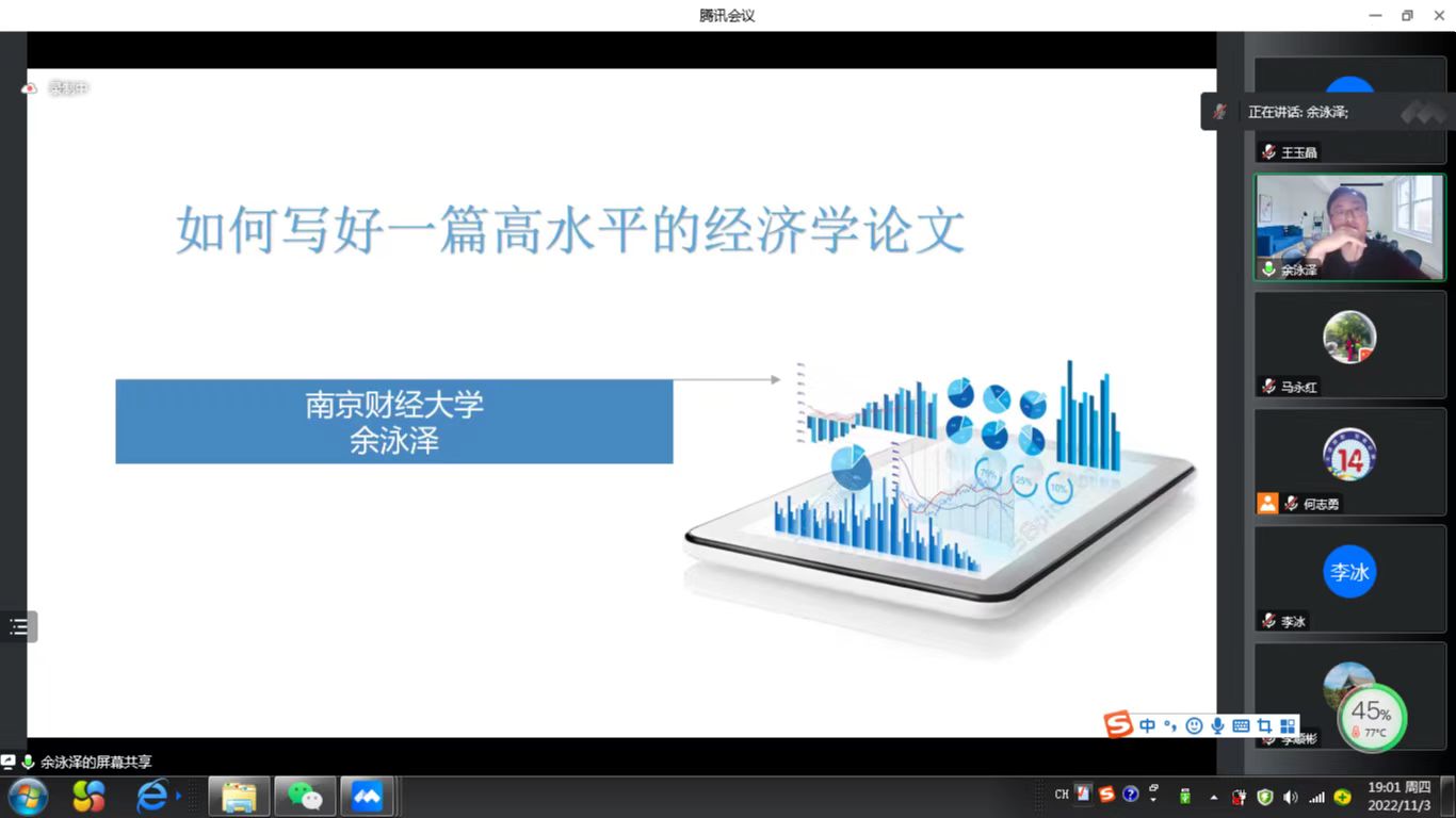 讲座历时120分钟,余教授重点就做什么样的研究、如何做研究、投稿及论文写作等细节进行了深入的讲解,期间艾明晔和李顺彬等多名老师就论文选题的时效性、实证模型的应用以及论文投稿等问题与余教授进行了深入的交流,余教授在云端为师生提供了宝贵的科学研究和论文写作经验盛宴,参会师生收获颇丰。
