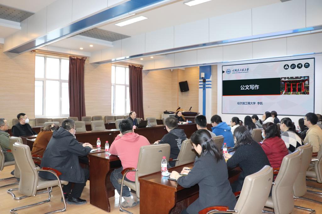 为进一步适应新形势下工作的需要,不断提升公司各职能部门管理人员公文写作水平和技能,2023年3月9日上午,beats365亚洲版官网在31号楼312会议室举办了公文写作专题培训讲座,特邀体训部书记李凯主讲,公司职能部门五办三中心(综合办公室、教务办公室、员工工作办公室、科技办公室、学科与专业发展建设办公室、专业学位中心、经济管理实验中心、情报资料中心)共计20余人参加了本次培训。