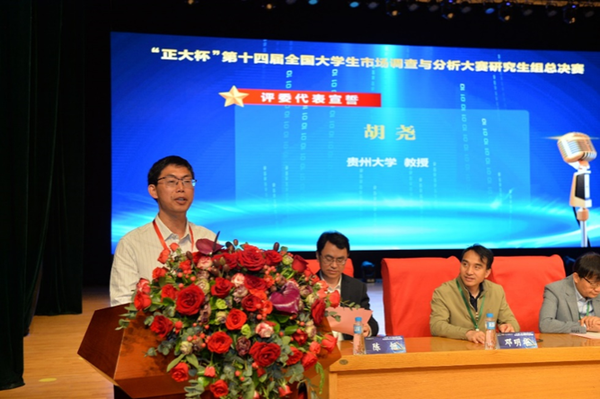 贵州大学教授胡尧代表全体评委在总决赛开幕式上庄严宣誓,将认真履行评委的职责,确保本次市调大赛顺利进行。