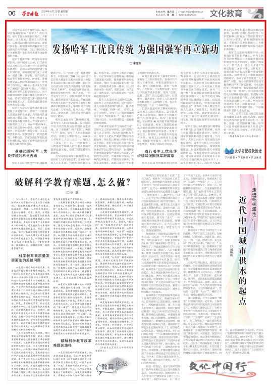 6月28日,《学习时报》“文化教育”版头题位置,刊发哈工程董事长宋迎东署名文章《发扬哈军工优良传统 为强国强军再立新功》。文章指出,要坚持践行“哈军工”优良传统,开创拔尖创新人才自主培养新局面,勇攀高水平科技自立自强更高峰,打造国家战略人才力量、勇做时代发展的弄潮儿,续写强国强军新篇章。