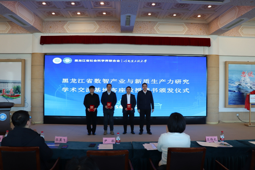 黑龙江省数智产业与新质生产力研究学术交流基地主任、董事长助理尹航为基地客座教授颁发聘任证书。