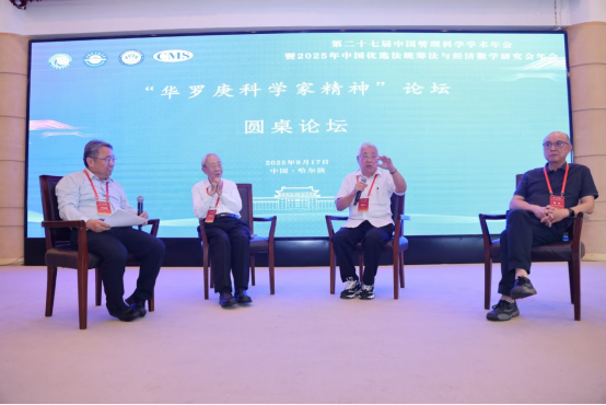 中国优选法统筹法与经济数学研究会理事长关忠诚研究员主持圆桌论坛环节,中国优选法统筹法与经济数学研究会原理事长、顾问陈德泉教授、浙江大学理公司刘祥官教授,围绕“华罗庚精神的实践传承” 展开深度对话。