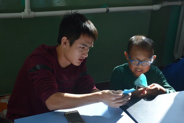 一进教室,孩子们就开心地和志愿者们打起了招呼,对志愿者的到来表示了热烈的欢迎。按照老师的要求,姜锋带领志愿者们对教室进行了重新布置,然后志愿者便和孩子们围坐在一起做活动。志愿者们带来了彩纸,简单分组之后,就开始教孩子们学习折纸。孩子们表现的十分认真,积极的动手操作。课间铃声响后,志愿者们放下手中的彩纸和孩子们一起做眼保健操。学习折纸后,孩子们拿起自己折的千纸鹤,小船,飞机等作品,都十分开心。活动于15时结束。