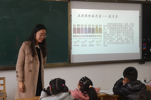 活动开始,郭雯进行了简单的自我介绍,接着便开始对同学们进行科学普及。郭雯为同学们解释了树叶变色的原因,随后郭雯为同学们播放的关于彩虹的视频引起了同学们极大的兴趣,主讲人与同学们对于彩虹的形成进行讨论,孩子们积极踊跃发言,现场气氛热烈。郭雯又教给同学们如何利用生活中的材料制造简易彩虹的方法。15时30分,在同学们的欢声笑语中活动结束。
