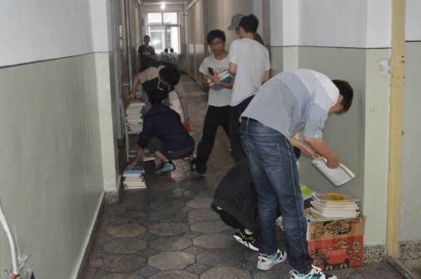 刚到目的地,大四员工早早就把书籍放到了寝室门口,然后所有人在王权亮的指挥下将书籍分成专业课书籍和非专业课书籍两类,专业课书籍被整理送到31号楼,以方便后续提供给公司需要的同学,非专业课书籍总共600余本捐给了爱心超市。20:30分,活动顺利结束。