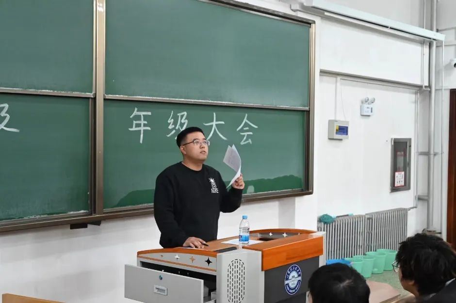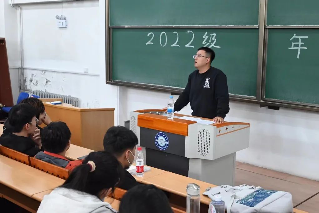 本次大会由2022级本科生辅导员张胜强主持。张胜强辅导员在开场时点名后,分享了一个实用的工作小技巧——任何会议带本记笔记,工作更高效。会议开始,张胜强导员提出了一个具有创意性的建议,鼓励每位同学“凝练自己的标签”。他指出,“初入大学的新生们,人和人都是相似的,这导致人与人相处的时候缺乏记忆点,而一个没有记忆点的老员工,要脱颖而出是困难的,所以我们现在要做的是‘挑起摸高’。张胜强导员激情讲到:只有同学们找到自己的长处,做好自我规划,把握机会,发挥优势,不断沉淀,才能跳出井底,拥抱更多彩的老员工活。