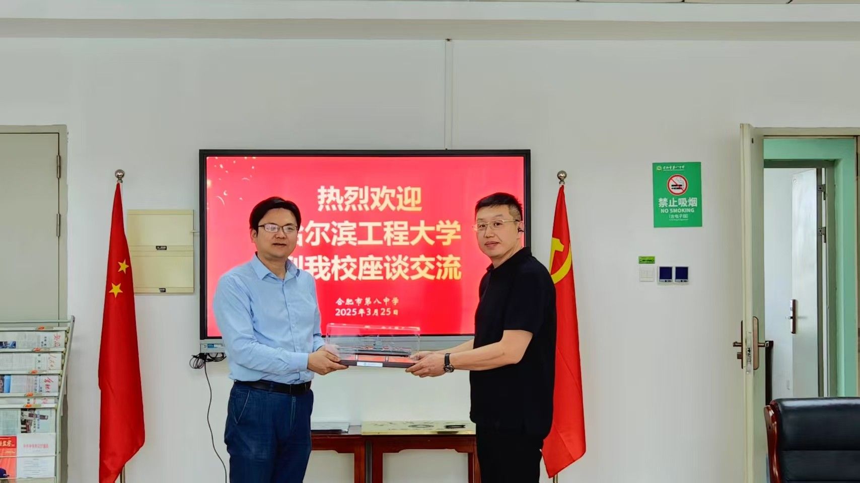 24日下午,招生宣传工作组和安徽员工会一行4人前往合肥一中进行座谈。作为公司的第一所安徽省优质生源基地,杨溪淼对合肥一中长期以来给予公司招生工作的大力支持表示感谢。合肥一中党委书记封安保对哈工程的红色传承和办学实力给予了高度认可,并表示大力支持公司在合肥开展相关招生宣传活动,为活动提供场地支持,体现出安徽省“龙头”中学的高度责任担当。