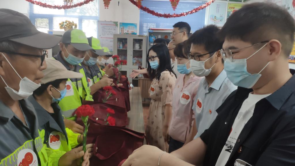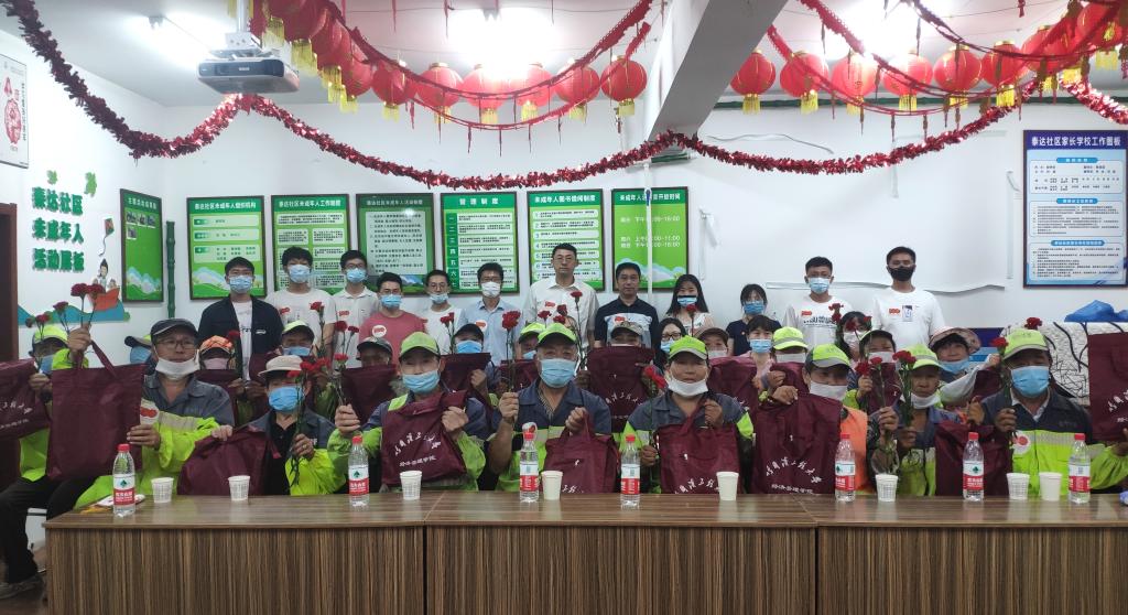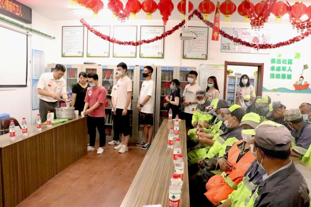 此次公司党委与泰达社区联合开展的“校社联动送清凉 爱心情暖环卫人”志愿服务活动中,公司党委副书记吴雷与环卫工人们亲切交流,送出美好祝愿。公司的师生党员们将煮好的绿豆汤逐一发到了环卫工人手中,随后为辛苦在一线的环卫工人赠送鲜花,口罩,湿巾,凝胶,毛巾等防疫大礼包。捐赠现场一片爽朗而愉快的笑声,炎炎夏日里,爱心物资“清凉”地温暖了环卫工人。活动后,环卫工人发来微信:炎炎烈日,是你们给我们带来了凉意。感谢你们的爱心举动。我们会把我们的家园打扫的更加干净,整洁。公司在了解到泰达社区“关爱失独家庭”情况时,主动为三户失独老人家庭捐赠防疫礼包和鲜花,委托社区工作人员送至家中。
